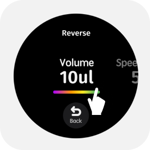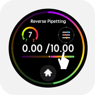 Tap the upper half of the main screen to enter the parameter menu.By swiping or tapping the screen, you can adjust in the parameter menu: aspirate/dispense volume, aspirate and dispense speeds, mixing volume, mixing speed, blow-out option, and repeat aspiration on/off.