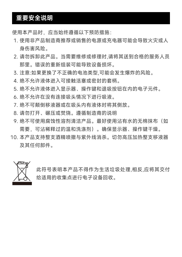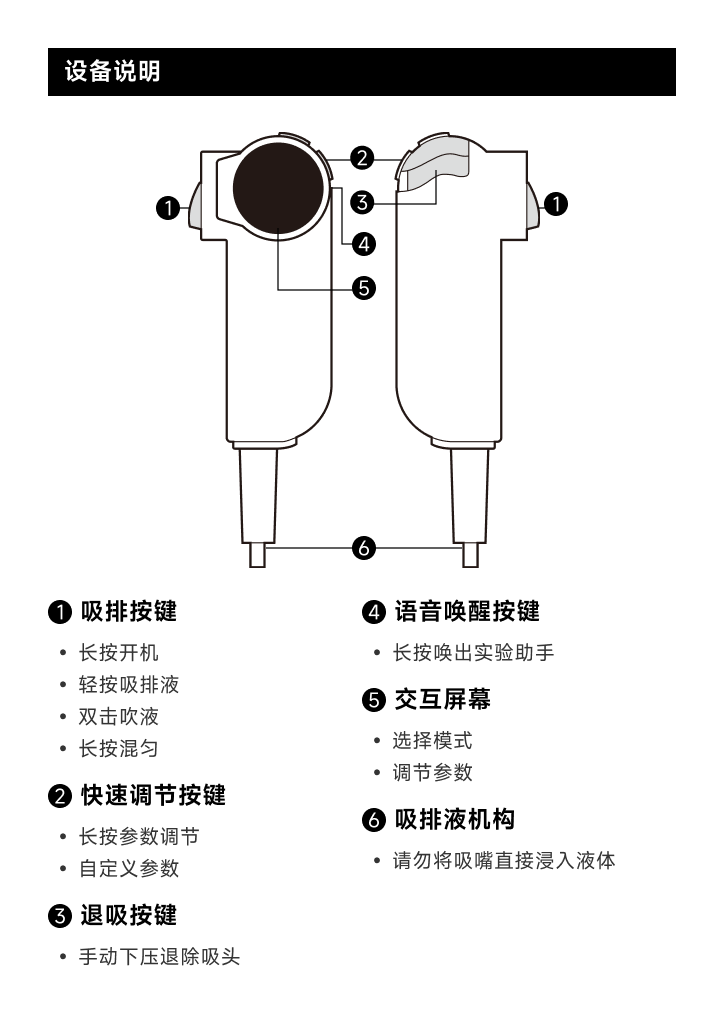 在首次使用 @Pett Mini 之前,请查阅以下描述的按键功能和移液器使用重要安全说明。